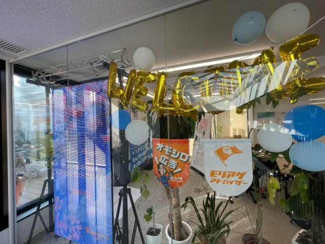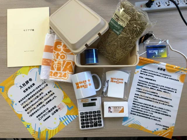 中には、名刺や入社辞令タペストリー、社長からの熱い言葉が書かれたタペストリー(家に飾ってね!)、そしてモリアゲオリジナルグッズがたくさん!