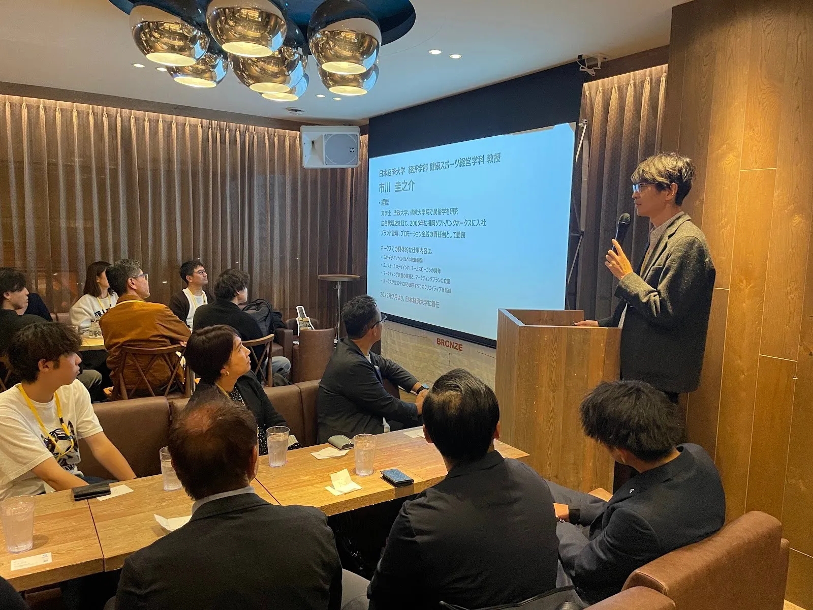 今回の特別ゲストスピーカーは日本経済大学経営学部健康スポーツ経営学科准教授の市川圭之介氏でした。市川氏は福岡のプロスポーツビジネスの実態や今後の展望などについてこれまでの経験や知識を基に詳しく説明しました。