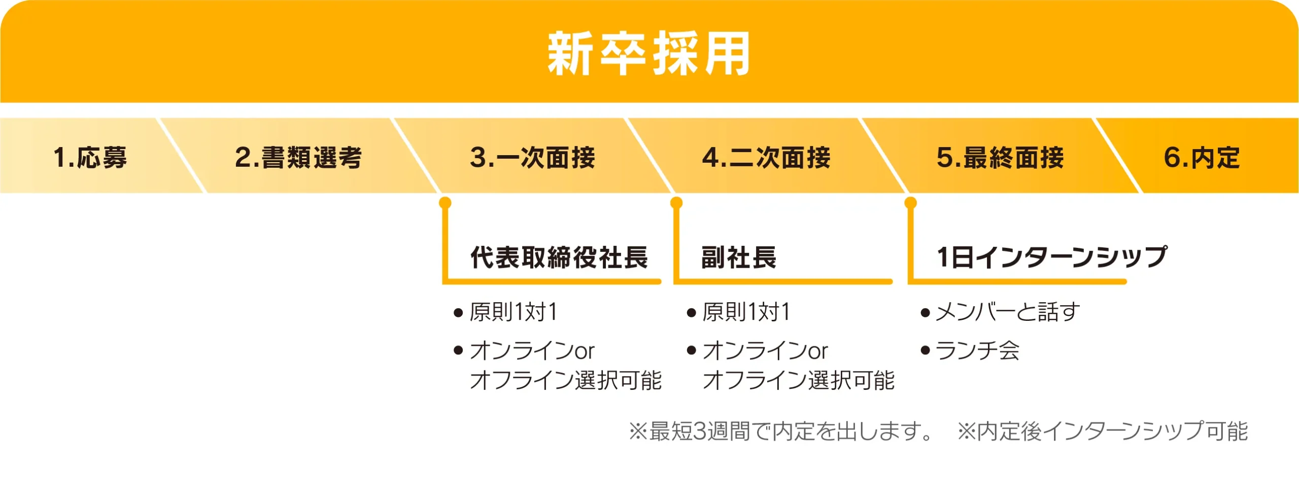 上部に新卒・中途・インターンの選考フローがありますのでご覧ください。